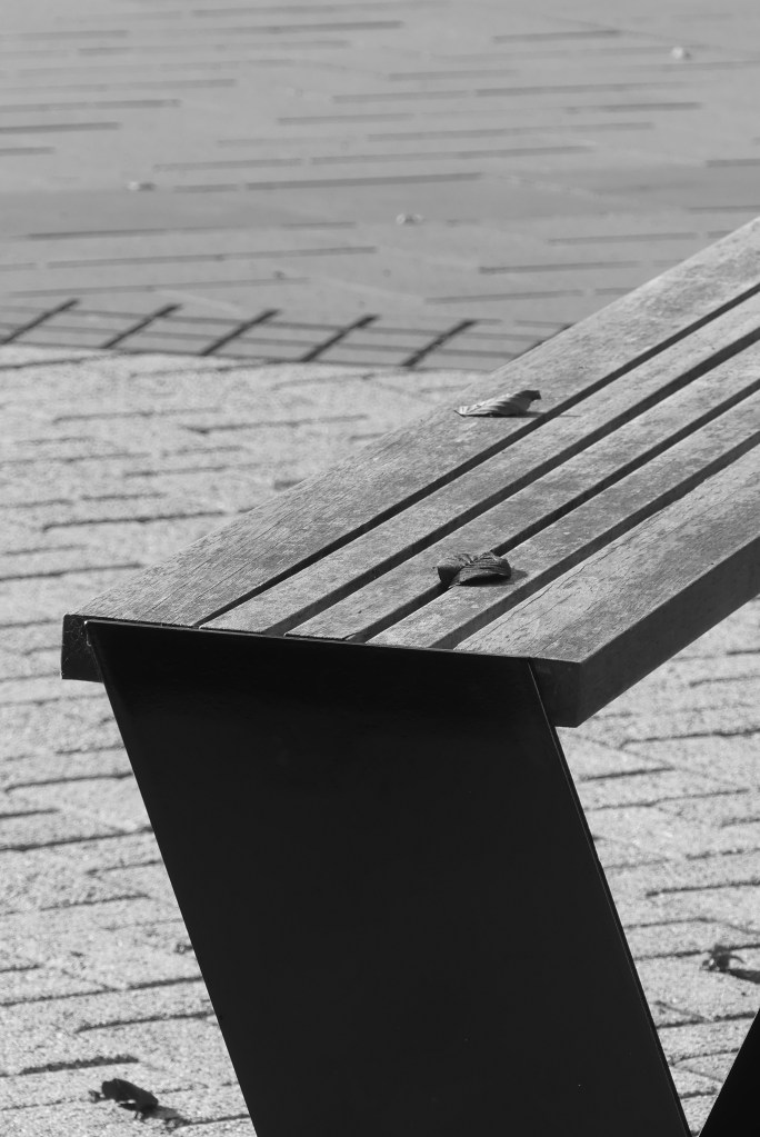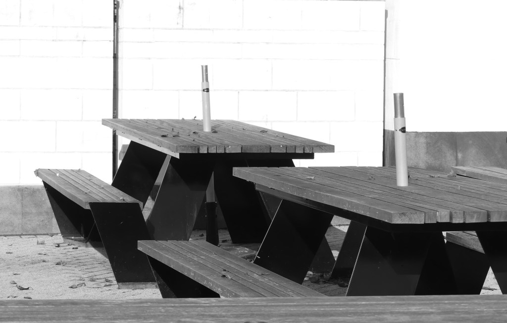 - Picnic table bench in black and white outside the St David Cafe on Otago University campus.
